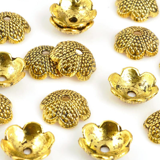 Pewter Findings Wholesale-13mm Textured Flower Cap-Antique Gold-Quantity 50