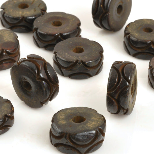 Carved-15mm Rondelle Bead-Brown With White Dots-Quantity 5