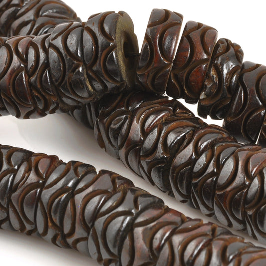 Carved-10mm Tube Bead-Brown With White Lines-Quantity 5 Loose Beads