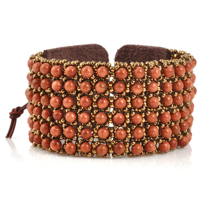 Brown "Leather and Lace" bead kit with Round Goldstone. Kit includes seed beads, 4mm goldstone, brown leather attachment, Size 12 glovers needle (2) and K.O. beading thread. Makes a bracelet to fit up to a 7 1/2" wrist.