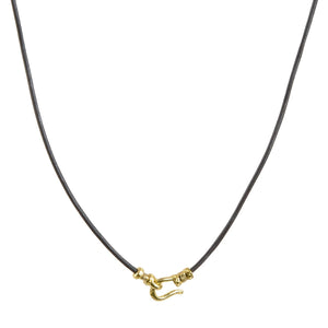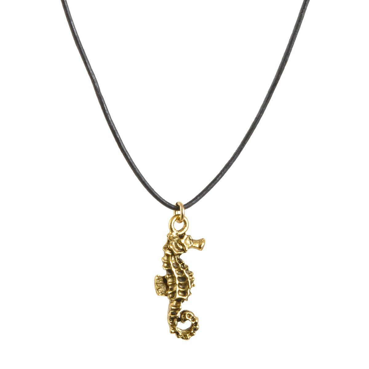 Seahorse leather necklace has a unique feminine allure. This dramatic and distinctive charm is plated in 24t Gold and aged to look like a piece of antiquity. The charm is strung on natural black leather cord. The necklace fastens with a brass hook and eye clasp.