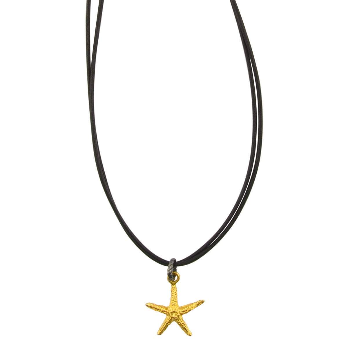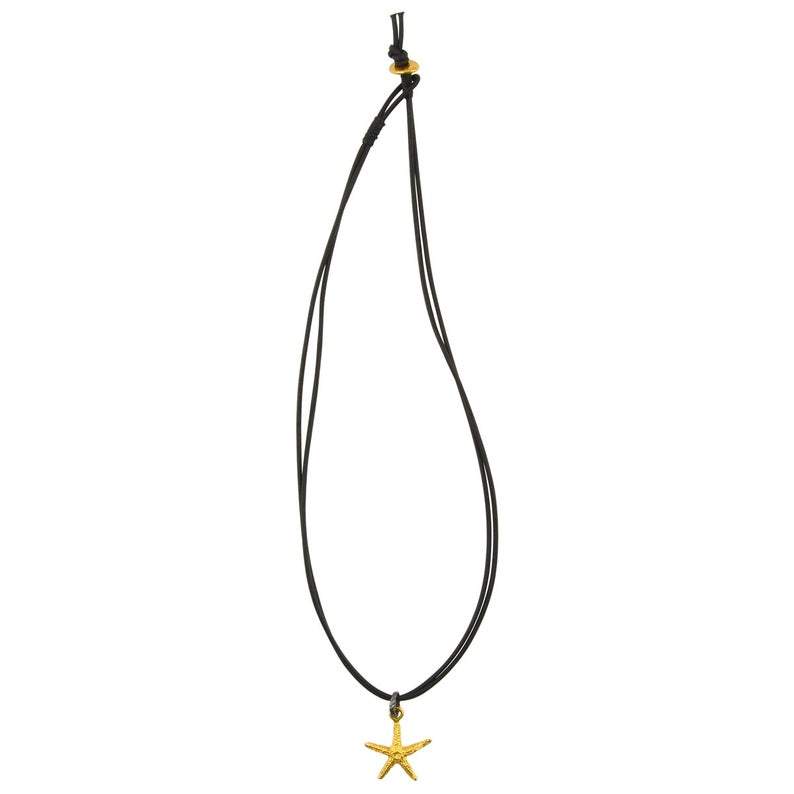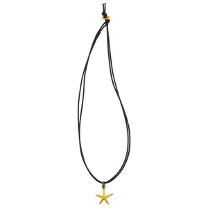 Gold Starfish leather necklace has a unique feminine allure. This dramatic and distinctive mix of gold plated ceramic and leather are strung on two strands of natural black leather cord. The pendant is attached with a contrasting gunmetal twisted metal locked jump ring to create an eye catching composition of color and texture. The necklace fastens with a gold plated ceramic bead and loop clasp.