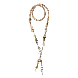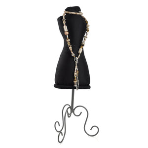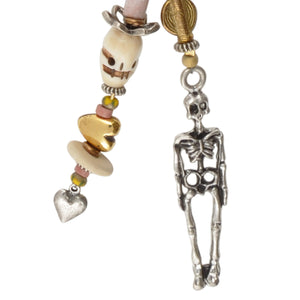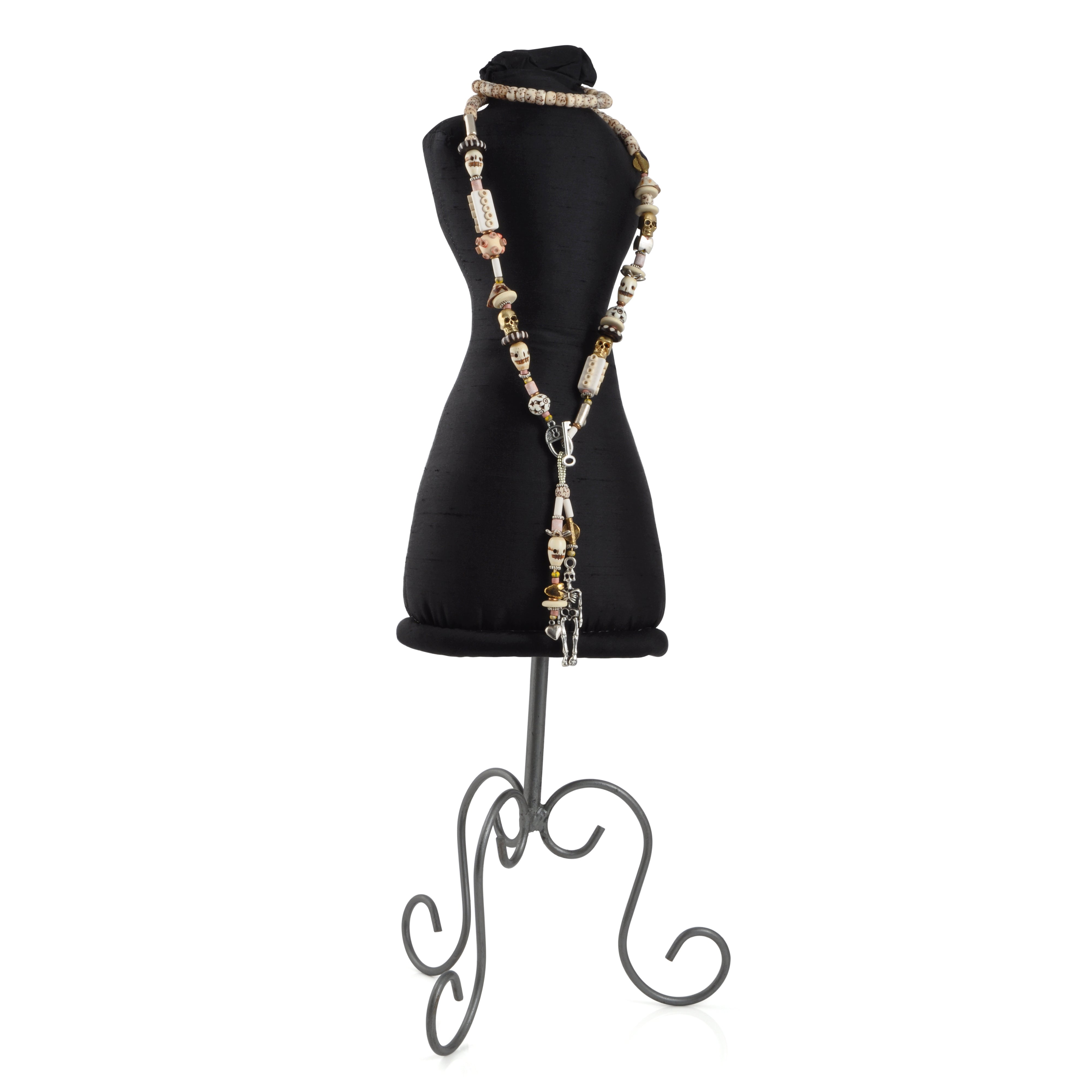 Lovely Bones mixed media beaded lariat style necklace with an ultra-feminine statement-making presence. The necklace includes a mix of gold and silver plated metal, natural, carved, pewter, brass, ceramics, and avante garde beads. The necklace fastens with a toggle clasp in the front. The skull and bones theme makes for a fun and unique piece. The necklace length is approximately 27 Inches with a 4 inch accent. Mannequin for display purpose only and is not included.