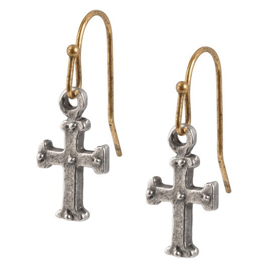 Finished Jewelry-Tiny Medieval Cross-Ear Wire Ball Earrings-Antique Silver + Antique Gold-One Pair