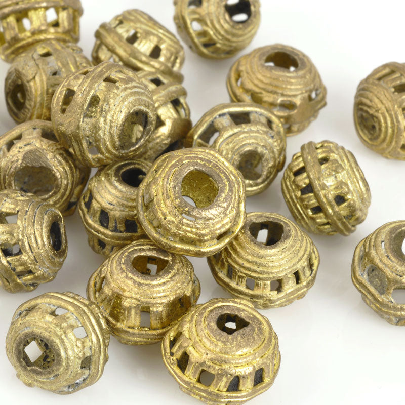 Brass Globe trade beads handcrafted individually through the lost wax process technique in Africa. Due to the handmade nature of these beads shape, color, weight, designs, and size may vary.