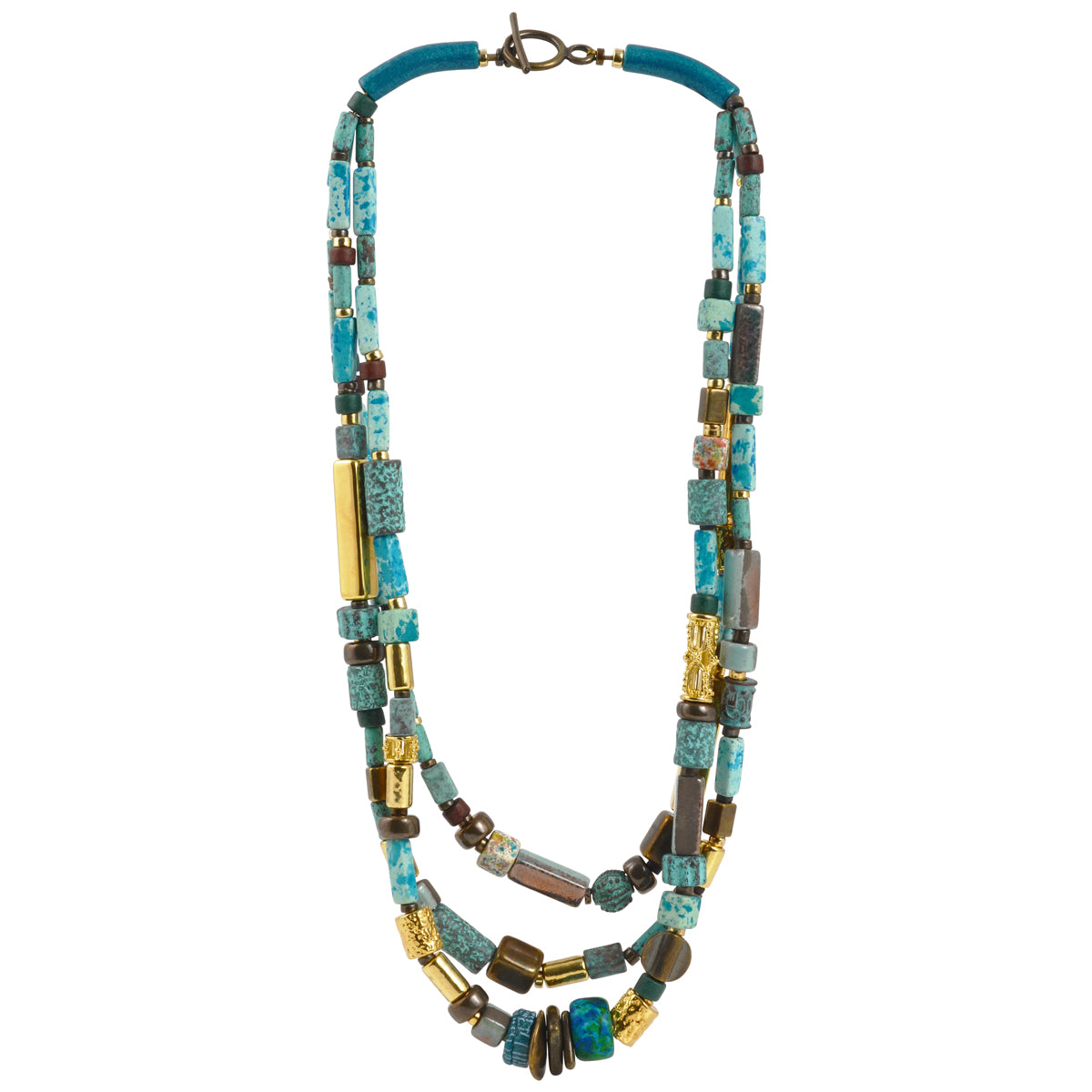 Romanesque mixed media three strand necklace with a style-defining, statement-making presence. An eclectic collection of antique bronze, gold, raku and green patina white metals and ceramic beads create the necklace. The necklace fastens with a toggle clasp. A striking mixed media essential with feminine elegance.