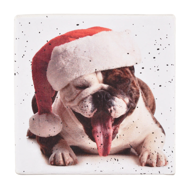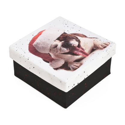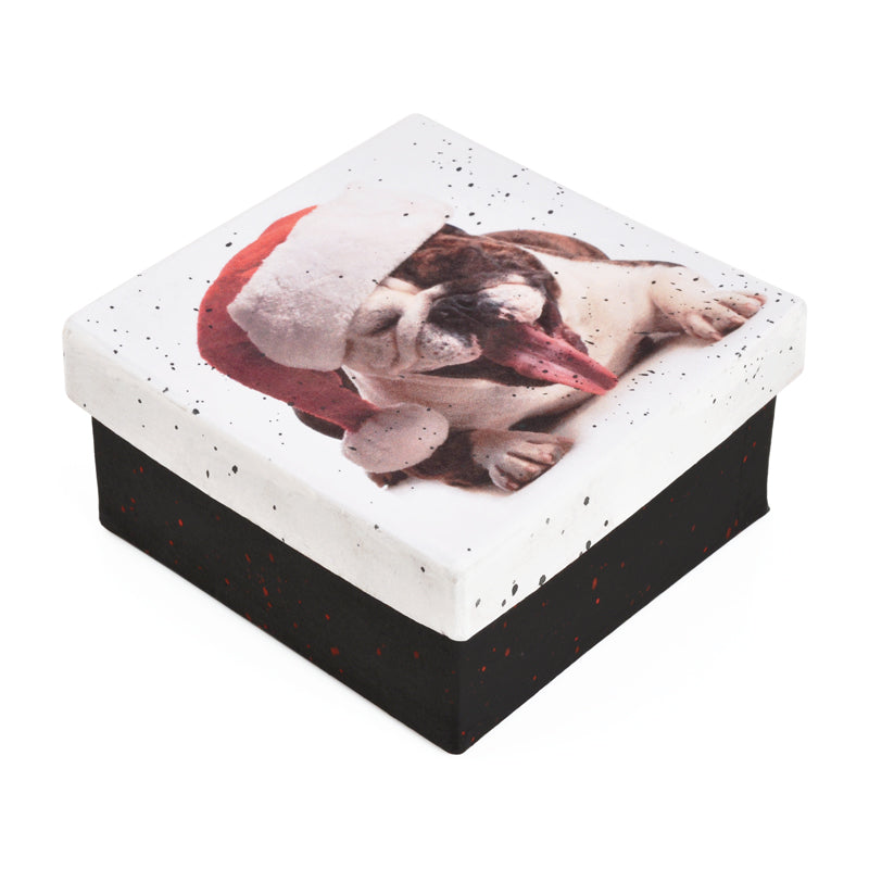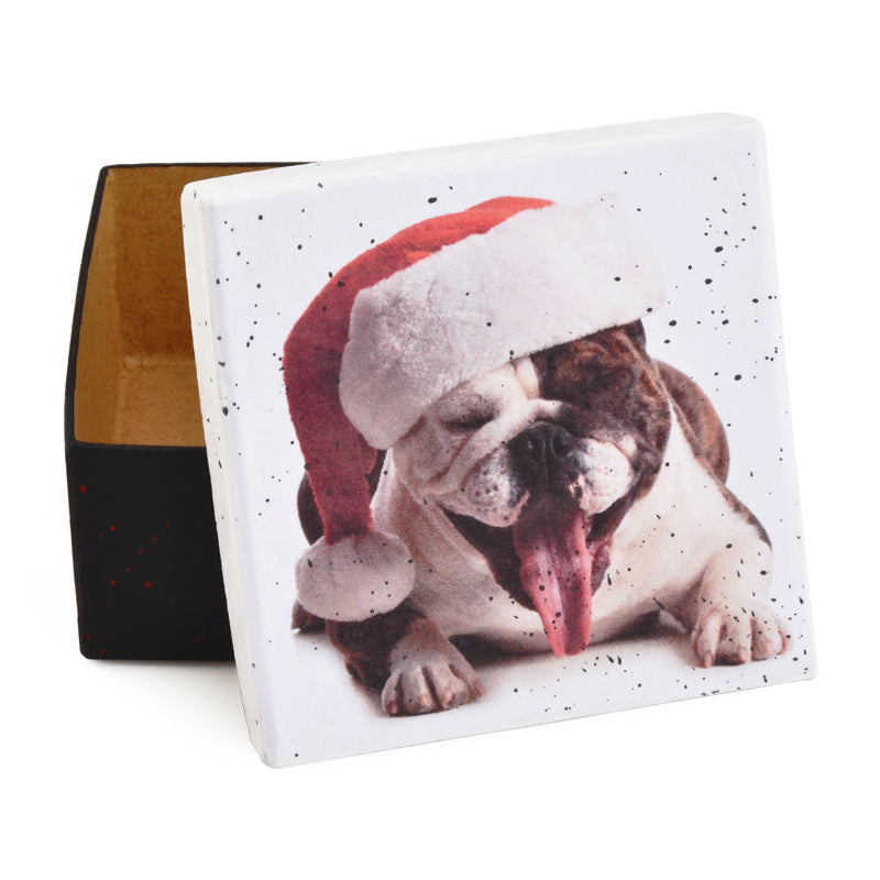 Shape: Square Box With Lid Image: Santa Dog Size: X-Small (3 x 1.5 Inches) Inside of Box: Unfinished (Natural Paper Mache)