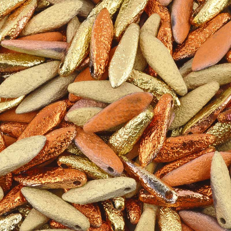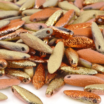 Quality Czech Glass Beads made in the Czech Republic. The Czech beads have a special added coating and do not have a permanent finish. You can use a spray fixative to seal the beads before stringing.Shape: DaggerColor: Crystal California Gold Rush-EtchedSize: 3x11mmQuantity: 20All Sizes Approximate