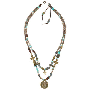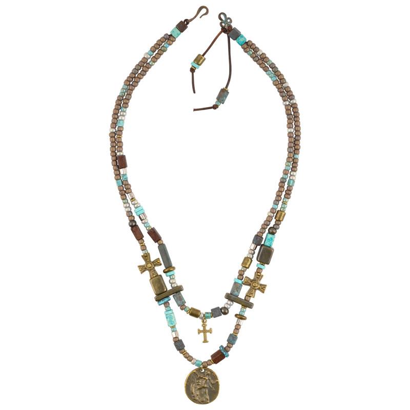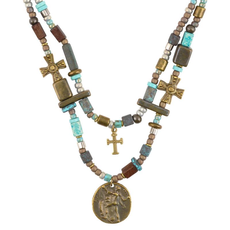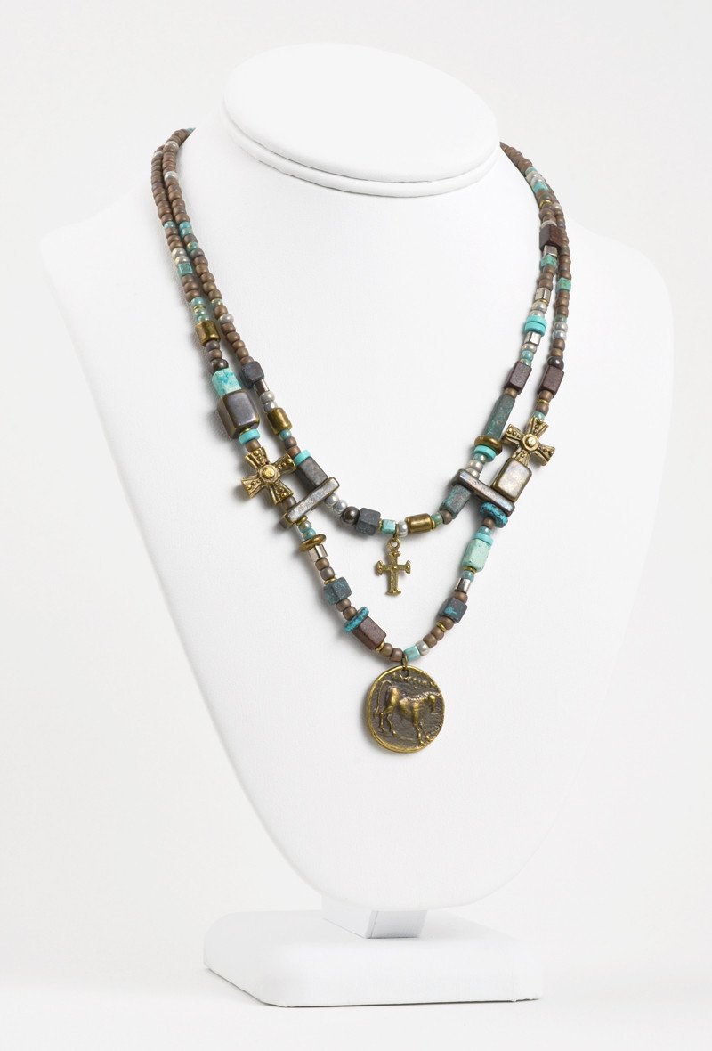 Earthy and elegant, this renaissance necklace is a turquoise and bronze-toned composition of color and texture. Ceramics, castings and glass beads are arranged with bronze accents to create a warm, casual everyday piece. Wear this alone, or add it to your favorite layered looks for added interest.