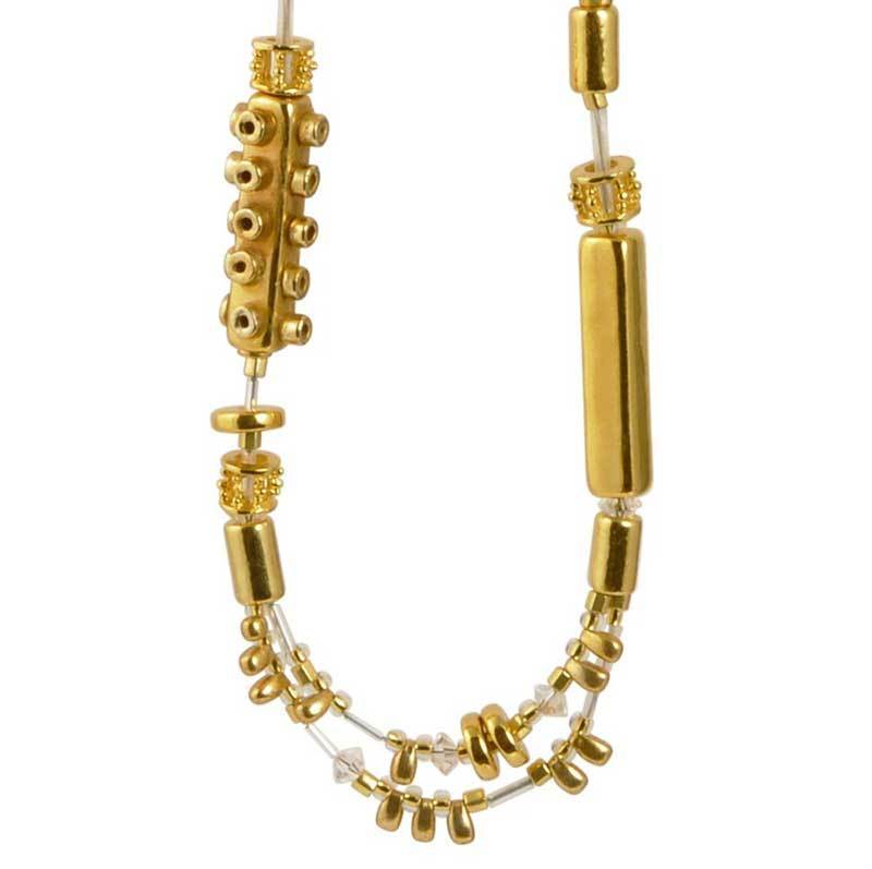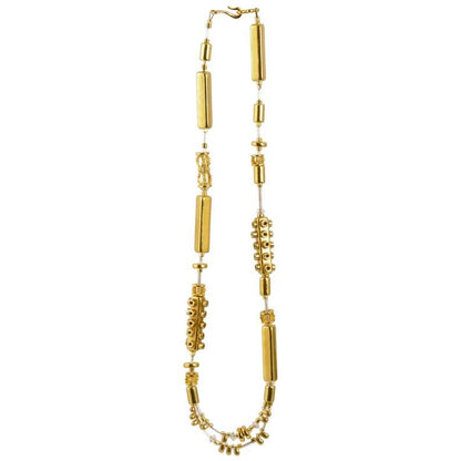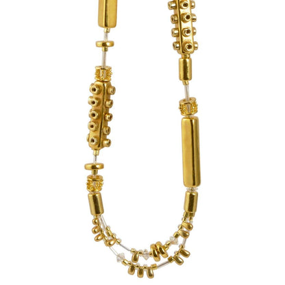 Decadent crystals beaded necklace with a beautiful gold and crystal variation. A blend of gold plated enamel ceramic beads, glass and crystals create a necklace that exudes a brilliant confident sophistication. The necklace fastens with a gold plated hook and eye clasp. This statement piece incorporates slider beads for a unique original look. Wear this alone, or add it to your favorite layered looks for added interest.